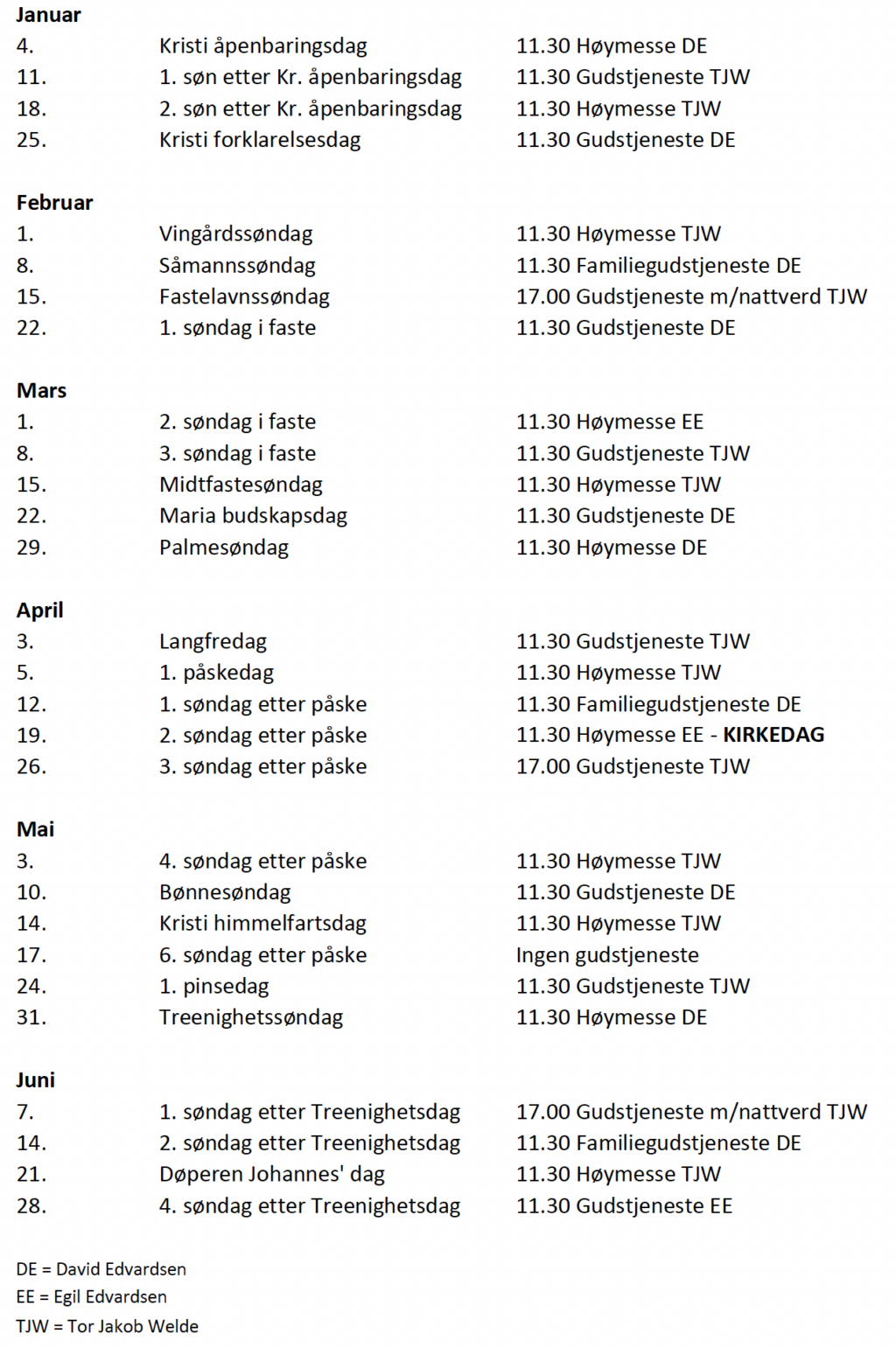 Gudstjenester: Søndag kl. 11.30 (enkelte søndager kl. 17.00). Vi bruker tradisjonell liturgi, med kirkeårets bibeltekster, salmer, bønner, osv.
